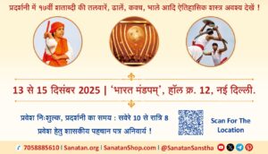 सनातन संस्थेच्या रौप्य महोत्सवी वर्षाच्या निमित्ताने देशाच्या राजधानीत होणाऱ्या महोत्सवात दिनांक १३ ते १५ डिसेंबर या तीन दिवसांच्या ‘स्वराज्याचा शौर्यनाद’ या नावाचे भव्य प्रदर्शन लावण्यात येणार आहे. हे प्रदर्शन हॉल क्रमांक १२ मध्ये सर्वांसाठी खुले राहील. या प्रदर्शनीत छत्रपती शिवाजी महाराजांनी हाताळलेल्या अनेक शस्त्रांचे साक्षात दर्शनही घेता येईल. यासमवेतच अन्य मराठा साम्राज्यातील सेनापतींनी चालवलेली शस्त्रे असणार आहेत. त्यात सरसेनापती हंबीरराव मोहिते यांचा भाला यांसारखी विविध शस्त्रे असतील.