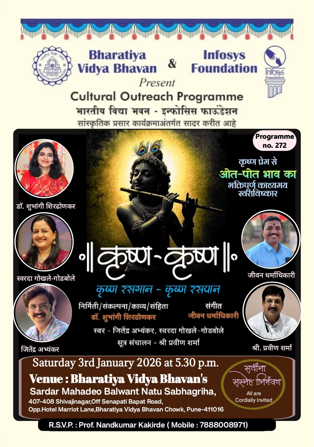 Pune: Under the Cultural Outreach Programme, jointly organized by Bharatiya Vidya Bhavan and Infosys Foundation, a special devotional music and poetic presentation titled “Krishna–Krishna” will be held on Saturday, 3rd January 2026 at 5.30 p.m.