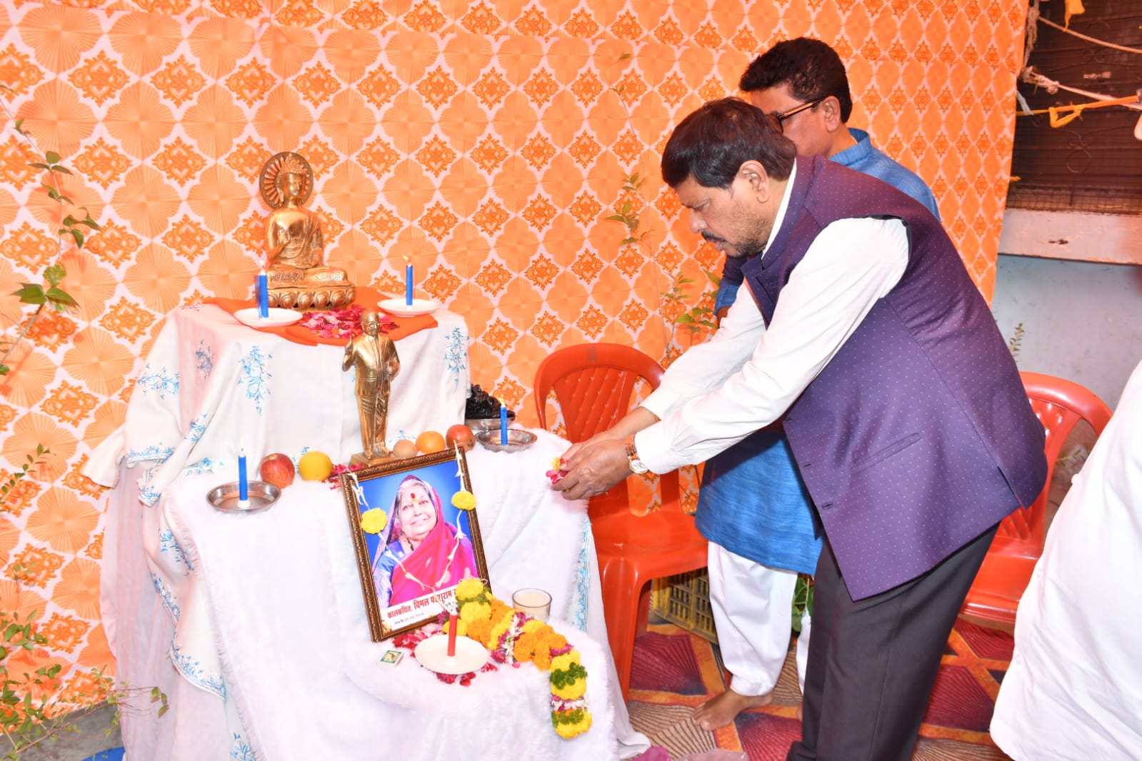 पुणे : रिपब्लिकन पक्षाचे पुणे शहर सरचिटणीस शाम सदाफुले यांच्या मातोश्री विमल सदाफुले यांचे 18 मार्च रोजी दुःखद निधन झाले. सदाफुले परिवाराची विचार पूस करण्या करिता रिपब्लिकन पक्षाचे राष्ट्रीय अध्यक्ष केंद्रीय मंत्री मा. रामदासजी आठवले साहेब यांनी काळवश विमल सदाफुले यांच्या पुण्यानुमोदन दिनाच्या दिवशी सदाफुले परिवारची येरवडा येथील राहत्या घरी सांत्वन पर भेट घेतली. शाम सदाफुले यांच्या वडिलांची आठवले साहेबांनी आस्थेने विचारपूस केली. याप्रसंगी उपमहापौर परशुराम वाडेकर, अध्यक्ष संजय सोनवणे, प्रदेश सचिव बाळासाहेब जानराव, सरचिटणीस महिपाल  वाघमारे, नगरासेविका हिमाली कांबळे, निलेश आल्हाट, जयदेव रंधवे, सुधीर वाघमोडे, संतोष आरडे व रिपब्लिकन पक्षाचे पदाधिकारी मोठया प्रमाणात उपस्थित होते.